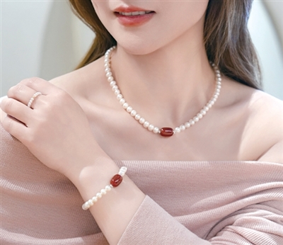 还有这款红玛瑙淡水珍珠项链手链套装,也是送妈妈、送外婆的主流选择。7~8mm的极强光珍珠+大气的红玛瑙,整体高级感拉满,还带有中式风格的雍容。