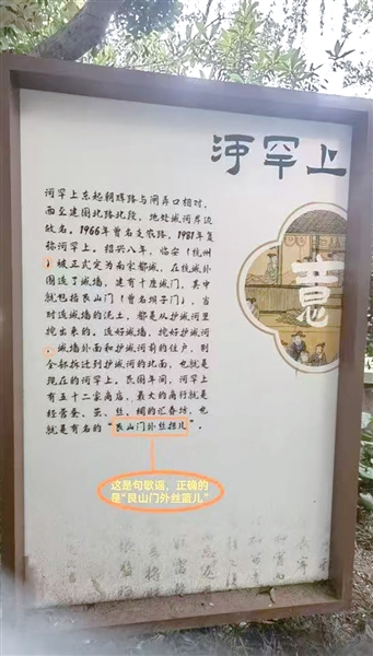 橙友“Nj14XZrQ”向橙柿直通车反映:河罕上运河岸边一东一西有两个公园,附近还有所小学,且是艮山门码头所在,日间游人众多,这里介绍地名的牌子还有好几个。给人的感觉是,除了牌子太大、内容显少之外,主要是失于规范,即文字不应顶格书写,标点符号的位置也有错误。此外,当地相传的歌谣也是错的,希望相关部门处理一下。