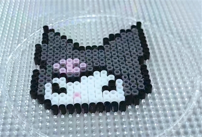 第二步,对应图案,选出所需要颜色的“豆”。根据图示用“豆”开始拼装。“豆”很小又滑,需要用镊子轻轻地一颗颗夹起来,放入平板的小凹槽里。整个过程用了40分钟,需要不断地数某个部分使用了几颗“豆”,以免整体错误。这一步确实很解压,需要十分专注、耐心。