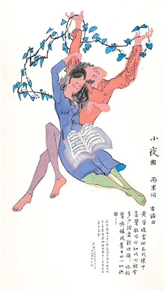 这幅《小夜曲》是黄永玉的最后一件作品,创作于2023年5月。当时,他脑海中反复回响着78年前与妻子张梅溪相识时哼唱的一首法国老歌——《古诺小夜曲》。家人找到了这首歌曲的五线谱与歌词,黄永玉便以此为灵感创作。画中题写着歌词片段:“黄昏后,当你在我怀中柔声歌唱……”在黄永玉生命的最后时光,这首曲子被反复播放,陪伴他走完人生旅程。