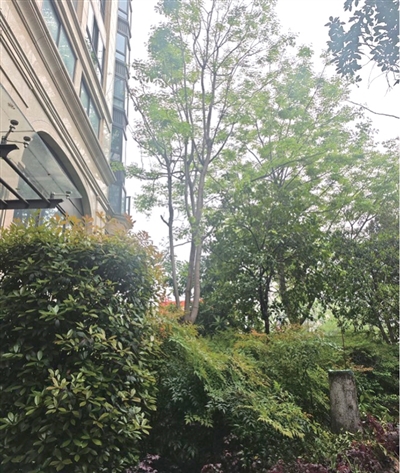 紫玉福邸小区2016年交付,小区绿化迄今也有十来年。记者注意到,不少高大树木紧靠着房屋,根部距离墙角三五米距离。通过数窗户,一些高大的树有六七层高。