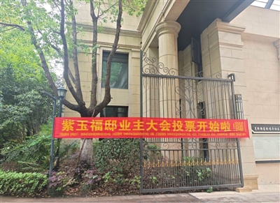 记者在紫玉福邸小区北门进出口看到“紫玉福邸业主大会投票开始啦!”的横幅,投票时间为4月23日下午2点到晚上8点半,4月24日上午9点到中午12点为止。