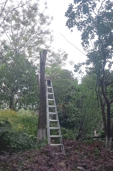 业主借了梯子,一开始说是修剪树木。