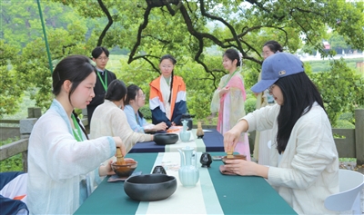 这一周,学生基本不在室内,而是在茶空间和户外穿梭。他们带着游客走茶山、讲龙井、做点茶、品茶饮,把梅家坞的茶文化名片一张张递出去。