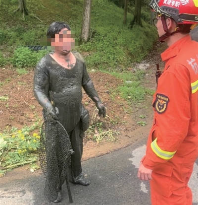 男子连同装满水产的水桶一同深陷淤泥,负重较大,拖不上来。经过耐心沟通劝说,男子最终同意放弃水桶,随后在救援人员指导下,男子脱下灌满淤泥、束缚行动的下水裤。