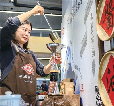 二楼是生鲜主场,蔬菜、鲜肉、粮油、禽蛋、服饰,日常所需基本都能在这里找齐。在“老大昌”酱油铺子,市民可以自己舀一瓶酱油带回家。