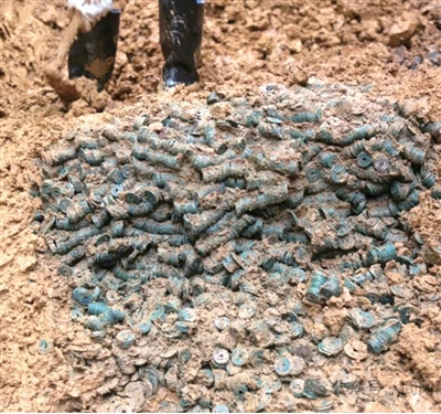 4月9日晚,湖南邵阳武冈市乐洋西路污水管网施工过程中发现大量古钱币。据武冈市文物局介绍,经初步清理,这批古钱币经目测预估有3吨(含水和泥土),目前能辨认出的年代最早的是唐代开元通宝,最晚的是绍定通宝。这是邵阳地区首次发现的大规模古铜钱窖藏。