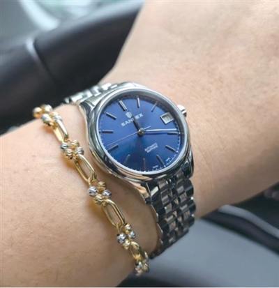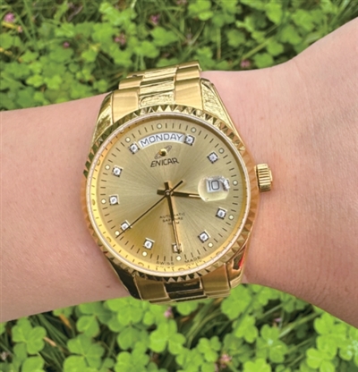 表身采用23K镀金,亮眼又大气。表盘干净利落,时间刻度镶钻点缀,简约又有质感。