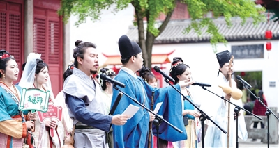 “苏轼”“陆游”“李清照”“辛弃疾”和市民游客在孔庙书市接力朗诵宋词