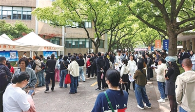 8点不到,浙江工业大学朝晖校区门口人来人往,校园里不少穿马甲的志愿者正在给家长和考生做引导。