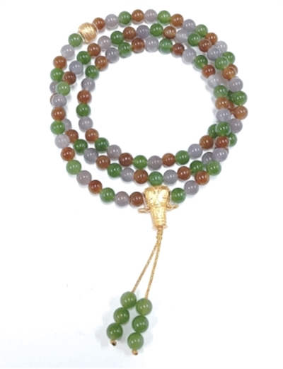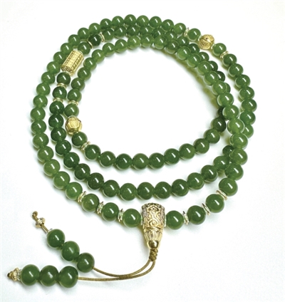 我们这次碧玉的好货也不少,比如这件百福玉安和田玉108珠项链,碧色浓郁油润,非常贵气。