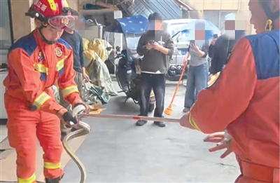 4月17日中午,临平区乔司消防站接到报警,一条蛇闯入居民住宅。消防员抵达时,现场已经围了不少群众,村里微型消防站人员正用捕蛇钳尝试抓。现场消防员说,当时这条蛇不断扭动,四处逃窜,抓捕难度大。“后来我们用抓蛇工具夹住蛇身,才抓到了。”