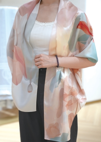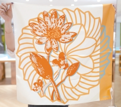 万事利小伙伴介绍说,“现在在秀场上,丝巾的热点又起来了,在春天戴一条,穿搭会很出彩,我们丝巾的配色都会加入一些灰调,相比爱马仕等欧美大牌的全亮色来说,更衬托亚洲人的黄皮肤,日常非常好搭配”。