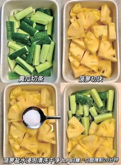 最近,一道听起来有些新奇的凉菜——菠萝拌黄瓜,在社交媒体上迅速走红。不少博主称其为“低卡清爽减肥晚餐天花板”,并纷纷晒出自己的制作视频:黄瓜切块,菠萝切块用盐水浸泡,加一点糖和白醋拌匀即可食用