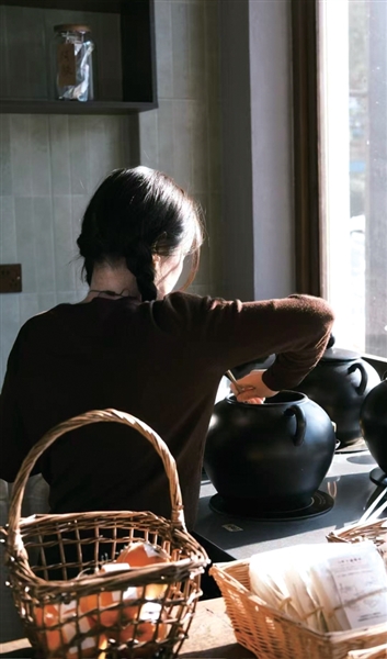 主理人敲敲在店里熬煮养生茶饮