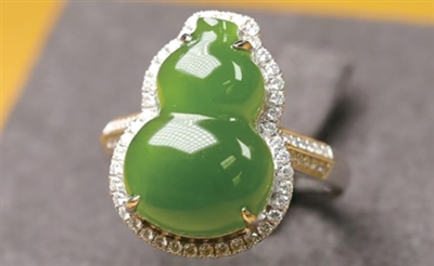 大福禄(葫芦)戒指,温润和田碧玉精雕福禄葫芦造型,玉色莹润,质感细腻。搭配18K白金精工底托,戒身环绕一圈璀璨碎钻,星光满圈、闪耀夺目。