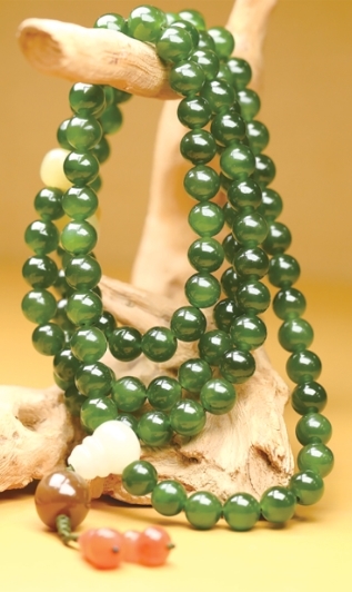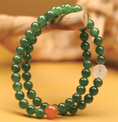 翠园春晓,精品碧玉双圈手串。精选碧玉,玉质细腻油润,翠色浓郁雅致,质地干净。