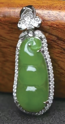 碧玉福豆吊坠(中),天然碧玉福豆吊坠,碧玉福豆莹润,饱满圆润,藏一生福气安康。通体18K金环绕钻石,熠熠星光托起玉色,轻奢显贵,温柔又高级。
