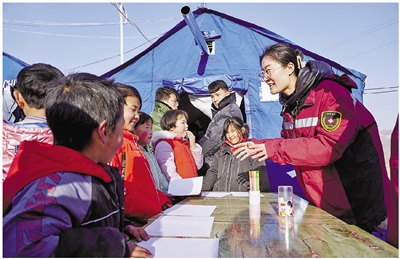 12月21日,在甘肃省临夏州积石山县刘集乡阳洼村的一处临时安置点,甘肃省心理救援队队员带着孩子们进行绘画,帮助他们减压。 新华社记者 马希平 摄
