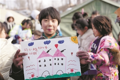 12月22日,在积石山县大河家镇大河村安置点,志愿者开设“小课堂”,小朋友展示自己的画作。 新华社记者 陈斌 摄