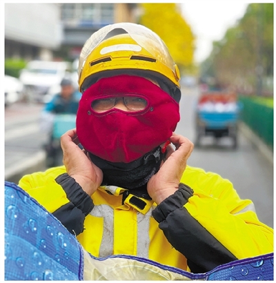 戴上社区送来的“防寒头套”,外卖小哥感到很温暖。