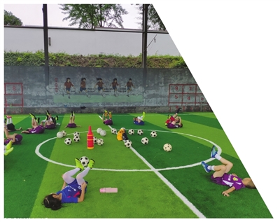 寿昌二小学生在足球场里分组练习