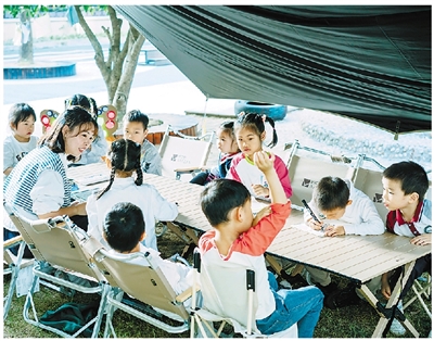 构建儿童友好环境,钱塘春晓幼儿园在户外天幕下举办伢儿议事团活动。