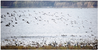 图为成群的白琵鹭、反嘴鹬等候鸟在杭州钱塘大湾区省级湿地公园飞舞、栖息(2023年11月27日摄)。杭州钱塘大湾区省级湿地公园是三江两岸景观廊道的终端、杭州东部生态带的核心区域,这里水质优良,动植物丰富多样,是多种冬候鸟的理想栖息地。通讯员 张祥荣 摄