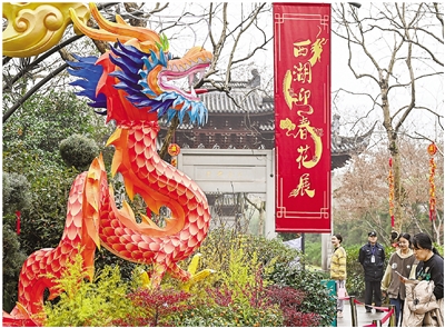 西湖景区工作人员介绍,该小品以龙年生肖为主题,将五只游动、跳跃形态的鲤鱼花灯和一只腾云而上形态的金龙花灯结合,勾勒出一幅鲤鱼跃龙门的美好景象,彰显了传统文化韵味。在背景处,还有浪花和青云搭配,表达海晏河清、四海承平的美好寓意。
