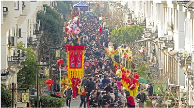 近日,建德市莲花镇开启“莲花游礼·戴家过年”第五届年俗文化节暨戴家过大年系列活动。图为在现场举行的“越吃越有味儿”乡村百家宴上,100桌家宴在莲花镇戴家新村民宿一条街上蜿蜒展开,村民们用精心准备的特色美食款待远道而来的客人。据悉,此次年俗文化节除百家宴外,还有舞龙舞狮、莲花清洁灯、跳竹马等非遗文化表演以及打麻糍、磨豆腐、做玉米粿等传统手工技艺体验,让游客感受到建德山乡原汁原味的年俗文化,在热闹喜庆的气氛中迎接新春佳节的到来。通讯员 汪勰 摄 记者 李忠 文