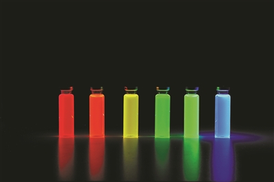 走进纳晶科技,一楼展厅里五颜六色的彩色溶液吸引了记者的目光。讲解人员介绍,这些发光的液体,就是半导体发光纳米晶材料,由于不同尺寸的量子点,可以在受到外来电、光等能量的激发后发出不同色彩的光,所以借由量子点材料作为显示屏背光材料,能让色彩更为丰富,也是人类已知最好的发光材料。