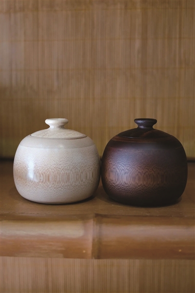 这次,我专程到安吉拜访了王波,看到亚运同款茶叶罐,既可以作为装茶叶的茶叶罐,也可以摆在书房里和文房四宝搭配,是极好的案台清供,还可以作为手把件,时时勤拂拭,日日来摩挲,包浆后就是一件极具质感的时光美器。