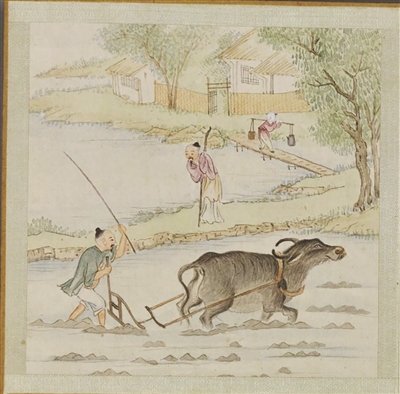 楼璹的《耕织图》用四十五幅画描绘了当时耕、织生产的各个环节,每幅图都配有一首五言诗。《宋史艺文志四》记载:“楼璹耕织图一卷,高宗阅后,即令嘉奖,并敕翰林画院摹之。”虽然这卷《耕织图》的原本和副本都已散失,但作为研究宋代农桑生产最早、最珍贵的图像资料,他的诗画风格影响了后世无数的摹本和刻本,被评价为中国绘画史、科技史、农业史、艺术史上的一个独特现象。