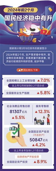 国家统计局18日发布的数据显示,今年前2个月,随着宏观组合政策效应持续释放,经济内生动能继续修复,生产需求稳中有升,发展质量不断改善,经济运行起步平稳,延续回升向好态势。
