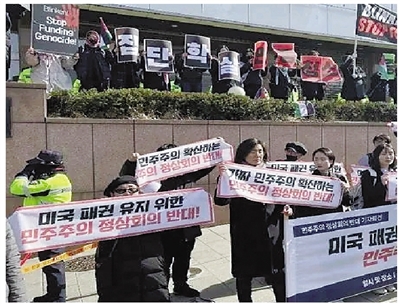 有集会参与者表示,“美国将‘民主峰会’举办地定在韩国,其意图十分明显,就是为了维持正逐步崩溃的霸权,将韩国推向阵营对抗的前线”。