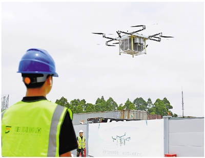 3月23日,在深圳宝安区的丰翼无人机运营中心,搭载着货物的无人机降落。 新华社记者 毛思倩 摄