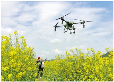 3月19日,农技工作人员在重庆市南川区东城街道三秀社区开展植保无人机飞防作业。 新华社发(罗川 摄)