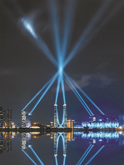 亮灯模式也有新变化。奥体中心场馆群和七甲河夜景灯光通过智慧控制方式,改变明暗和色彩,形成基础模式、诗画模式、表演模式等多种夜景灯光模式的切换展示,呈现多元丰富的照明场景。