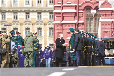 普京与参与阅兵式的人员握手。 新华社记者 曹阳 摄