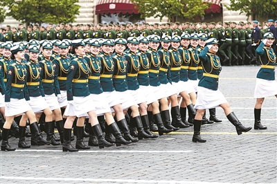 当天,女兵列队走过红场。 新华社记者 白雪骐 摄