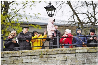 5月9日,在爱沙尼亚边境城市纳尔瓦,人们在河边观看对岸俄罗斯城市伊万哥罗德的胜利日纪念活动。