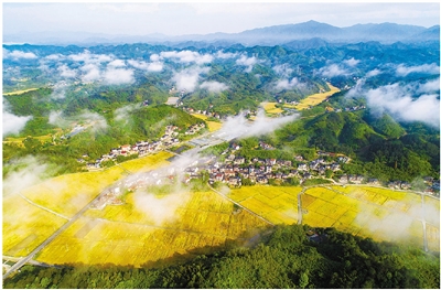5月14日,临安区天目山镇“天目粮仓”粮食功能区4000余亩连片农田里的小麦已经成熟,丰收在望,蓝天白云下的金色麦田与整洁的农舍、蜿蜒的道路交织成一幅镶嵌在绿水青山间的美丽“丰”景。近年来,该镇通过连片土地流转及统一开发管理,实施高标准农田建设,走出了一条农文旅融合的高效生态农业发展之路。
