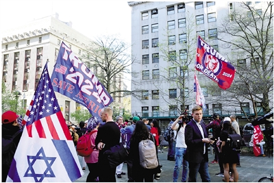 4月15日,在美国纽约,特朗普的支持者在曼哈顿一家刑事法院门前的公园里举行集会。特朗普当天在该法院出庭,出席关于其在2016年涉嫌伪造商业记录以掩盖向一名女演员支付“封口费”一案的审理。 新华社记者 刘亚南 摄
