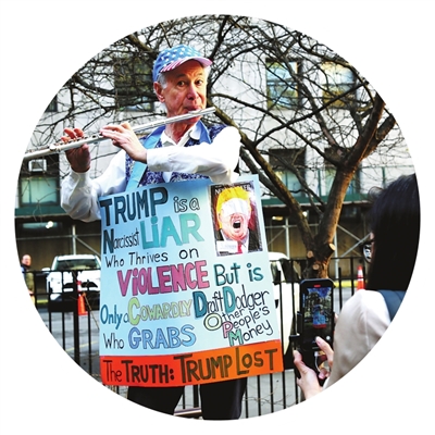 当天,特朗普的反对者在公园里挂着标语牌演奏乐器。