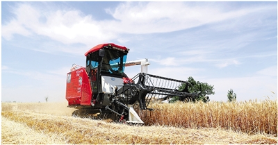 5月27日,安徽省蒙城县乐土镇农民驾驶农机抢收小麦。