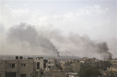 5月28日,加沙地带南部城市拉法在以军密集轰炸期间升起浓烟。 新华社发(哈立德·奥马尔 摄)