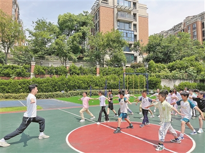 吴老师介绍,学校体育组老师在分析鸟类特征的基础上,结合学生身心健康发展需要,共同创编了“飞鸟体操”,共6个动作,分别模仿鸟儿站立、起飞、展翅、俯冲、捕食、归巢,时长约两分钟。“没想到学生很喜欢,尤其是张开翅膀模仿鸟儿飞翔的动作,大家做得特别起劲、特别到位!”