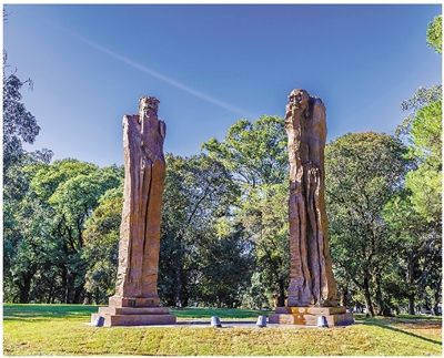这是5月28日在乌拉圭首都蒙得维的亚市中心的巴特列公园拍摄的雕塑作品《问道》。 新华社发(陈曦 摄)