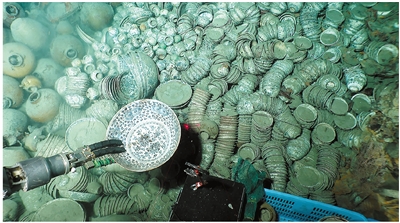 文物工作者使用深潜设备对水下文物进行提取(资料照片)。 新华社发(国家文物局供图)