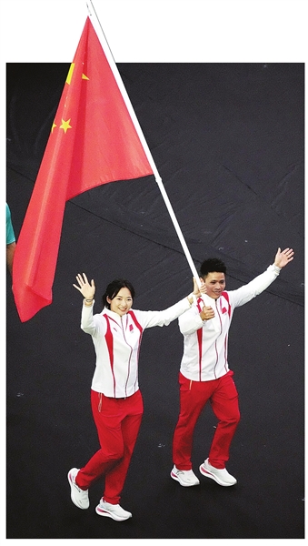 中国体育代表团旗手李发彬(右)、欧紫霞在闭幕式上入场。 新华社记者 吕小炜 摄